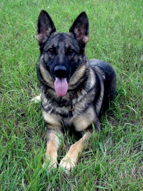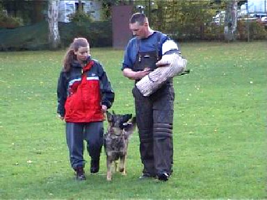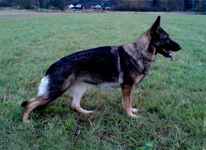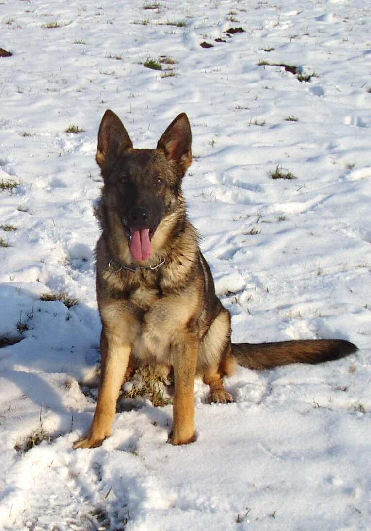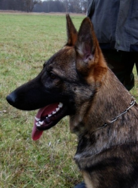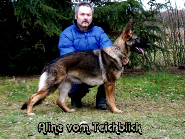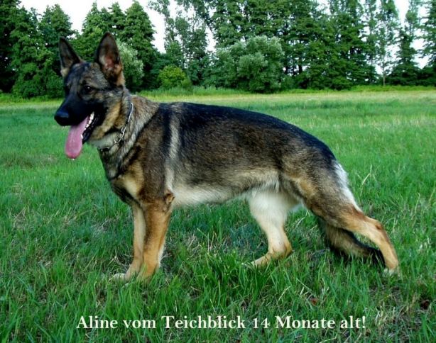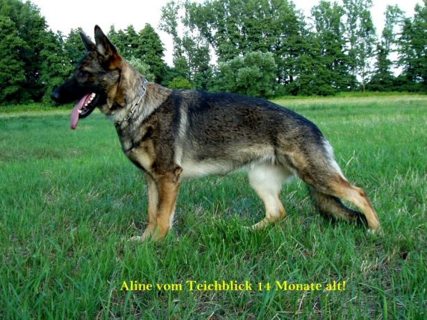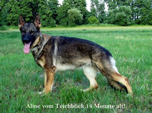 Aline ist eine sehr temperamentvolle, triebige Hündin bei hoher Triebbeständigkeit. Sie ist Aufmerksam, Führig und im Schutzdienst zeigt sie druckvolles Verbellen, geht sehr energisch in den Angriff mit vollem festem Griff, besitzt einen sehr guten Spieltrieb und im Schutzdienst das nötige Aggressionsverhalten! Aline ist pigmentstark und auch anatomisch für einen Leistunghund, sehr ansprechend, sie zeigt sehr gute Gänge bei sehr gutem Bewegungsablauf!